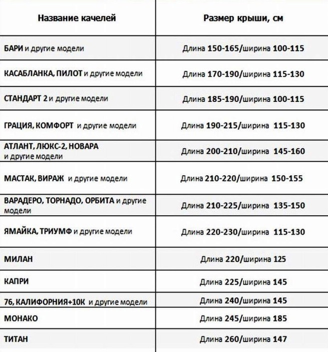 Базовые параметры тента для качелей: